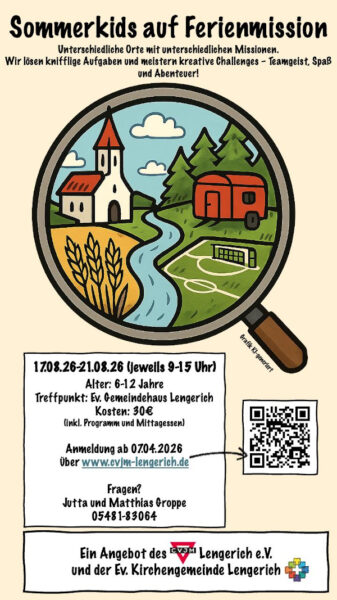 In der 5. NRW-Ferienwoche (Montag, der 15. bis Freitag, der 21. August 2026) findet jeweils von 9 bis 15 Uhr das Kinderferienprojekt von CVJM und Evangelischer Kirchengemeinde statt. Anmeldungen sind ab Dienstag, dem 7. April 2026 an dieser Stelle möglich.